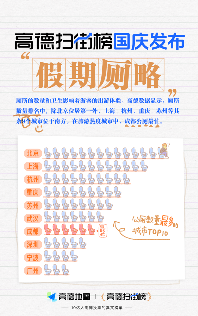 国庆吃喝拉撒都重要!高德扫街榜发布城市厕所榜、母婴室榜